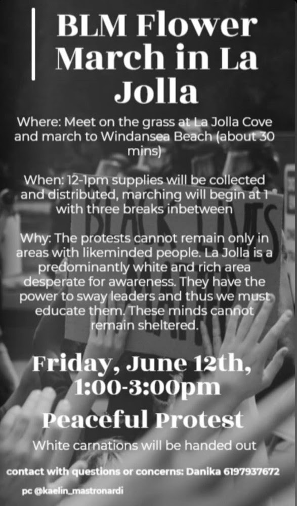 This morning, my Council Office received the announcement below for a Black Lives Matters Flower March in La Jolla, June 12 from 1:00 – 3:00 p.m.