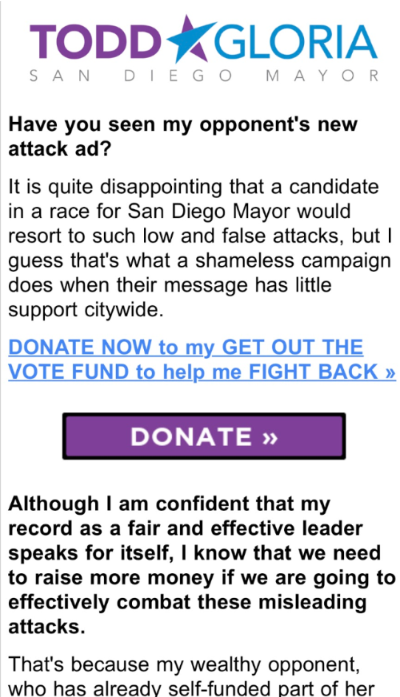 The phony fundraising pitch from Todd Gloria can be seen below.